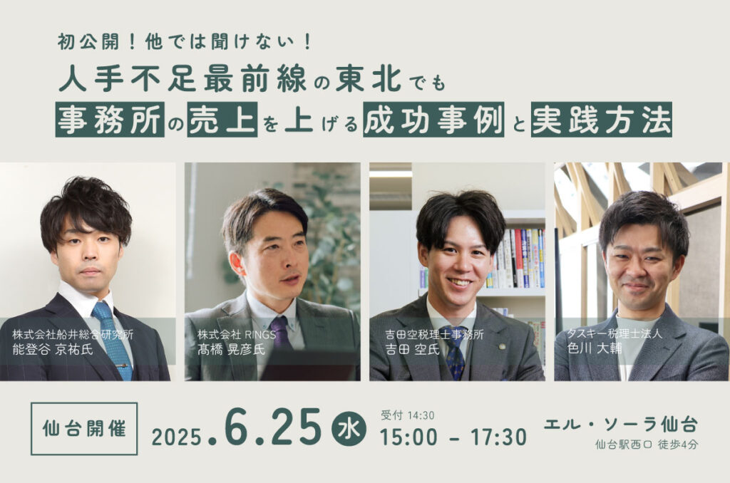 本セミナーでは、東北特有の課題を乗り越え「事務所の売上を向上させる」ための【成功事例】と【実践方法】を初公開します。