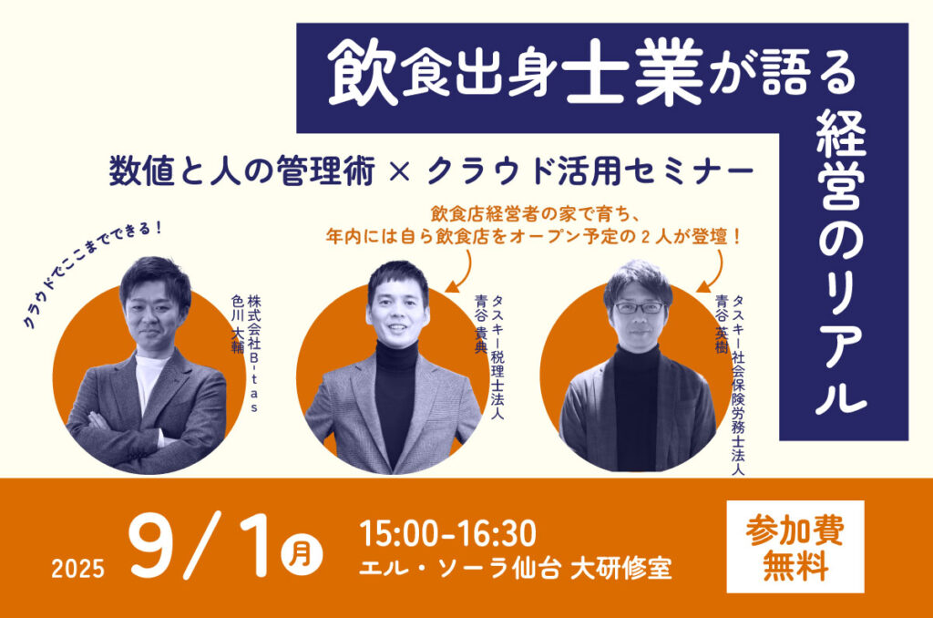 本セミナーでは、煩雑さを増す管理業務の負担を減らし、経営の“見える化”を実現するクラウド活用術と、飲食店経営を熟知した士業2人が語る、人とお金のリアルな管理ノウハウをお届けします。