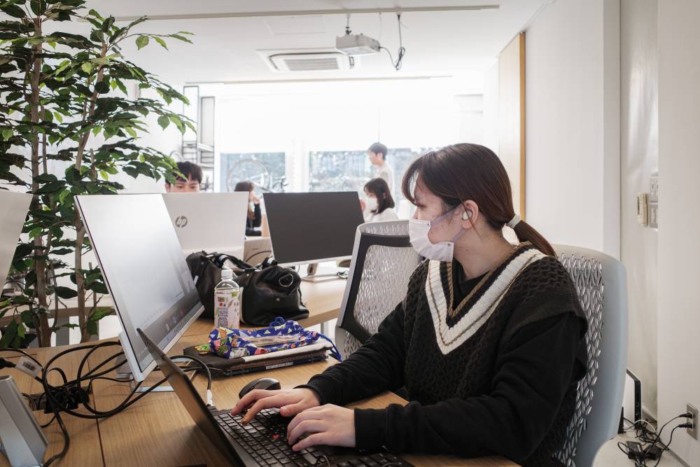 テレワーク(在宅ワーク)は、情報セキュリティ対策をして、ひとりひとりにPCを貸与し、クラウドツールやoVice(バーチャルオフィス)、WEB会議などを活用しながら行っています。